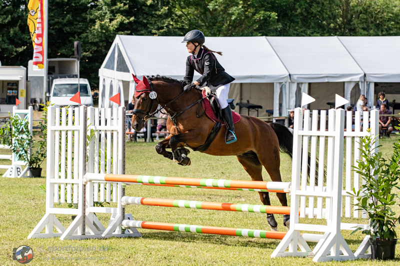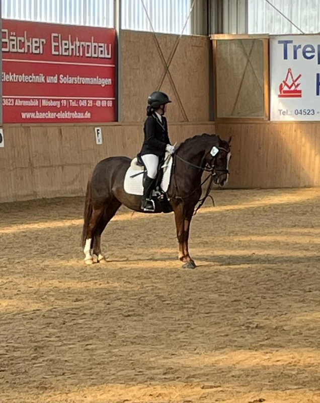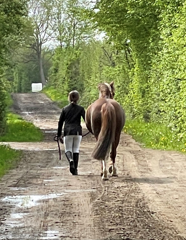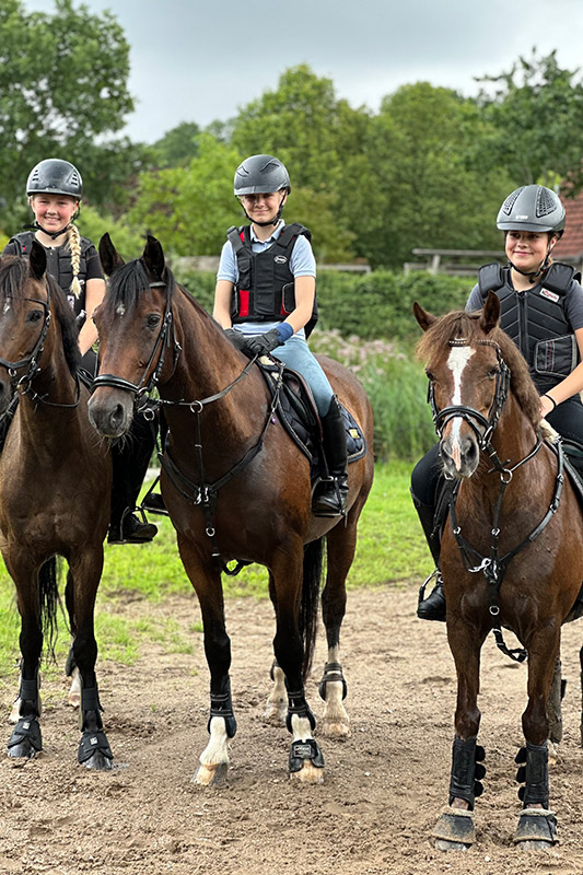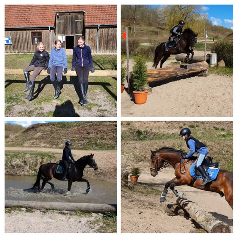 Zur Grundausbildung gehört auch das Reiten im Gelände, inklusive Training auf der Hügelbahn, an kleinen Naturhindernissen und bei Wasserdurchritten. Besonders gern besuchen wir den nahegelegenen Süseler Reiterpark und genießen die Zeit dort.